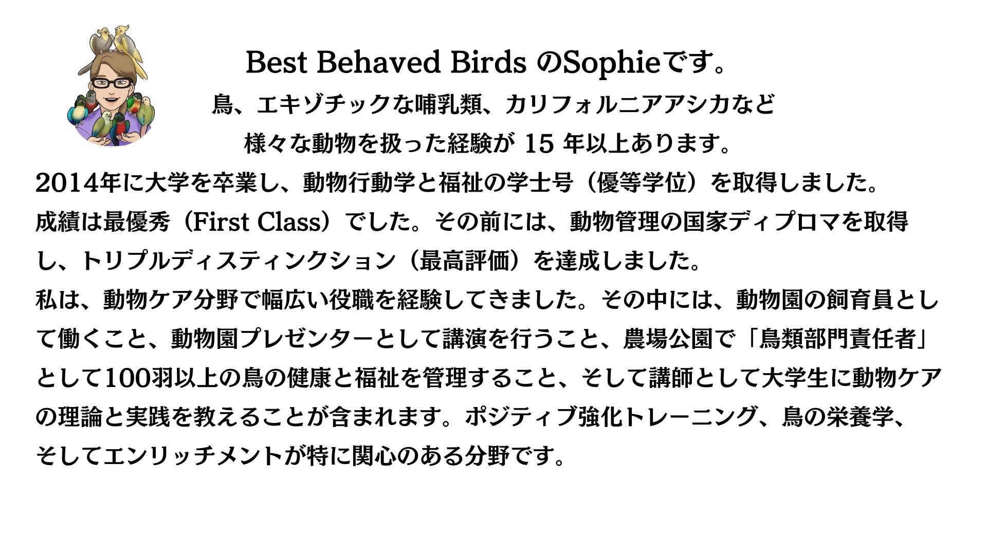 回答はイギリスの認定プロフェッショナルバードトレーナー Best Behaved Birdsのメンバーです。